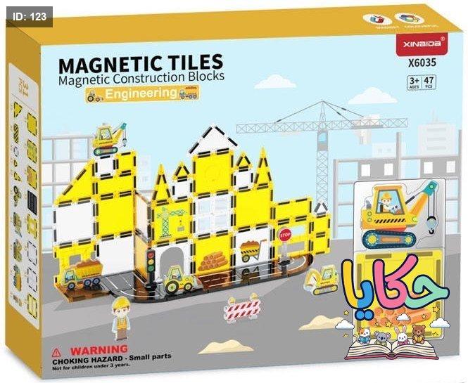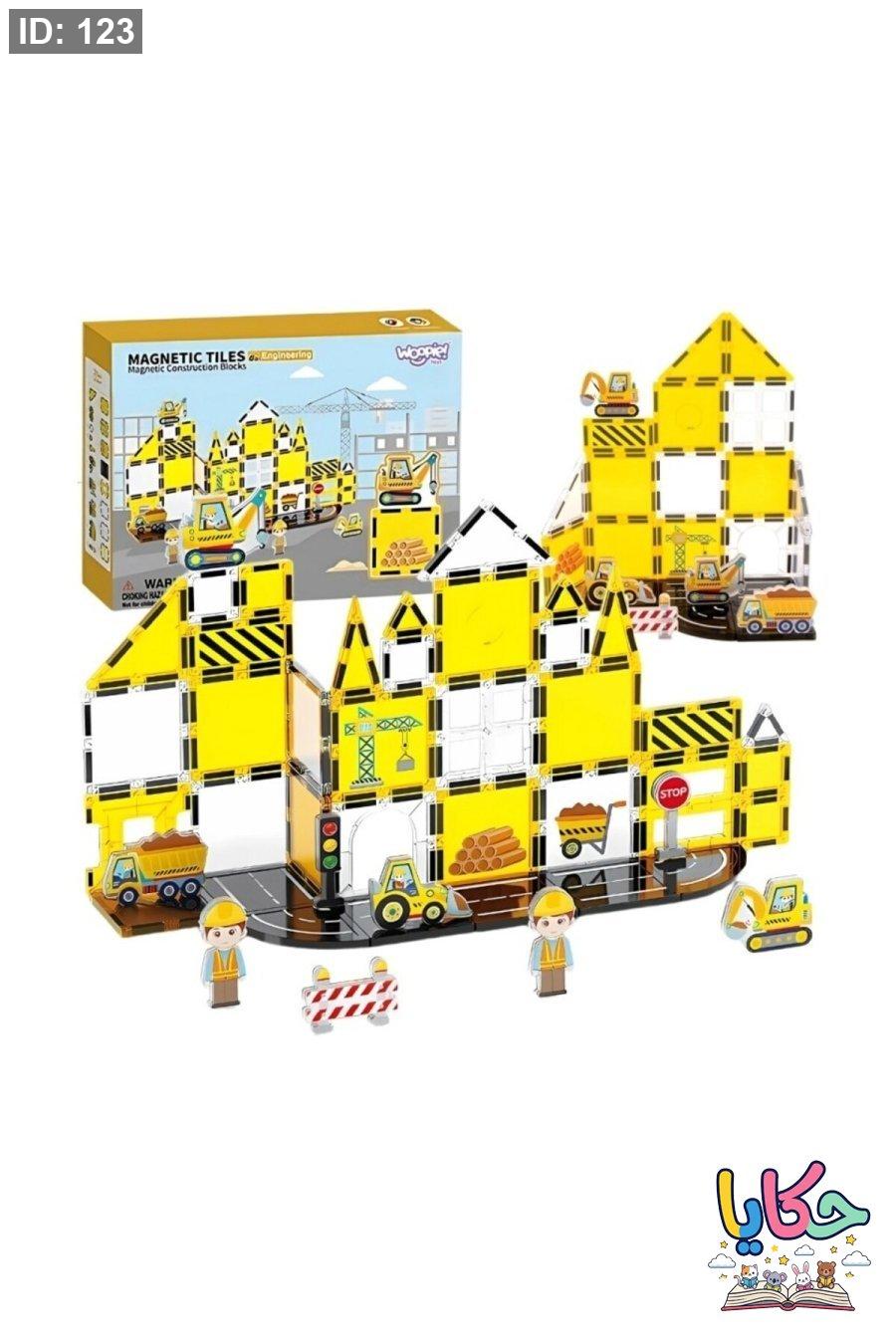 المجموعة تحتوي على 47 قطعة متنوعة تشمل قطع مغناطيسية، شاحنات، وعناصر ديكور لموقع العمل. 🏗️🚧