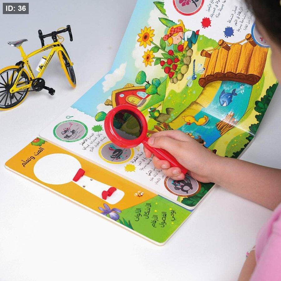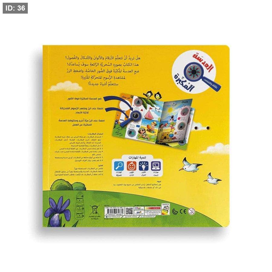 هلْ تريدُ أنْ تتعلَّمَ الأرقامَ والألوانَ والأشكالَ والفُصولَ؟ هذا الكتابُ بصورِهِ السِّحريَّةِ الرَّائعةِ سوفَ يُساعدُكَ! ضعِ العدسةَ المُكبِّرةَ فوقَ الصُّورِ الخاصَّةِ، واضغطِ الزرَّ لمشاهدةِ الرُّسومِ المتحرِّكةِ المُثيرةِ!