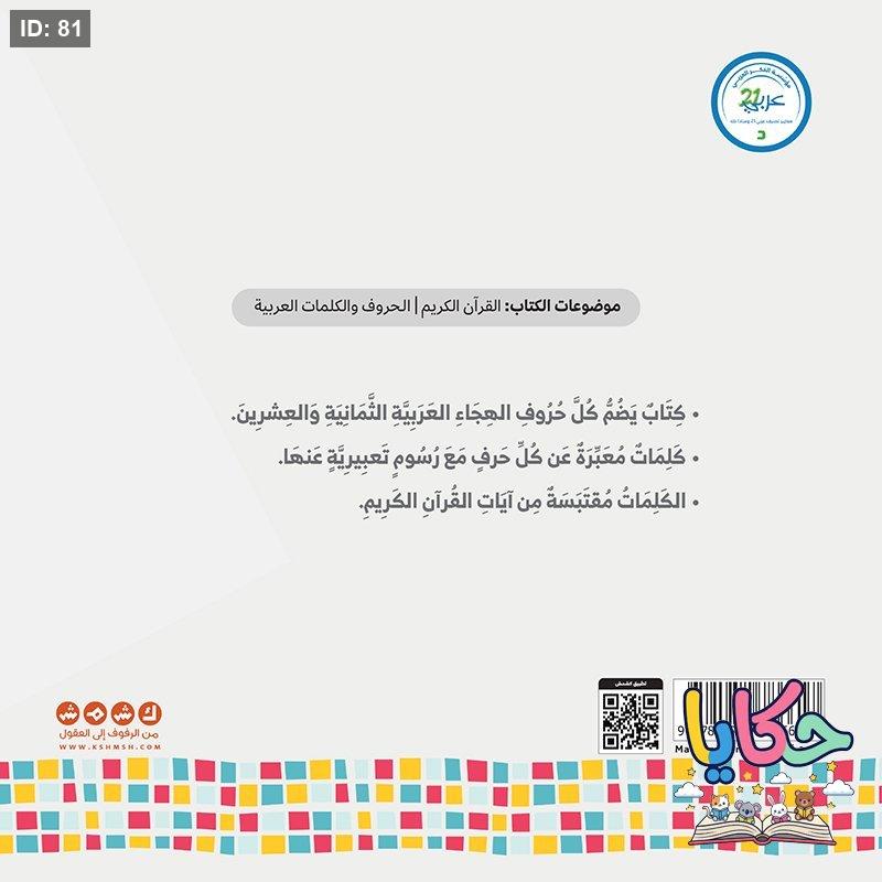 الهدف: تعليم حروف الهجاء العربية وربطها بكلمات من القرآن الكريم.المحتوى: كلمات مختارة من آيات القرآن الكريم لكل حرف، مدعومة برسوم تعبيرية لتسهيل التعلم.التصميم: جذاب وملون، مما يجعله مناسباً للأطفال الصغار (3-5 سنوات وما فوق).النوع: وسيلة تعليمية، قصص إسلامية، وسائل تعليمية ومدرسية